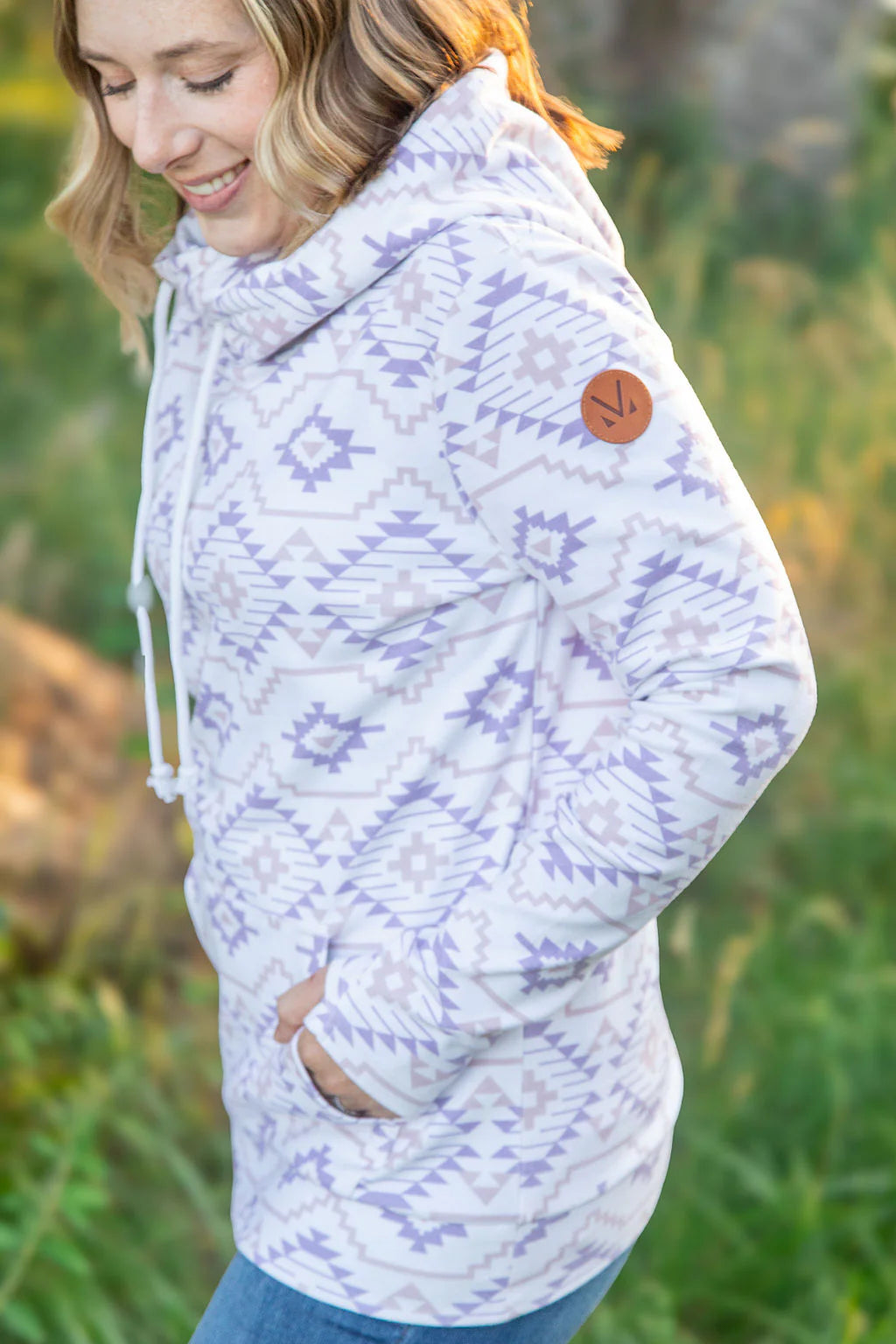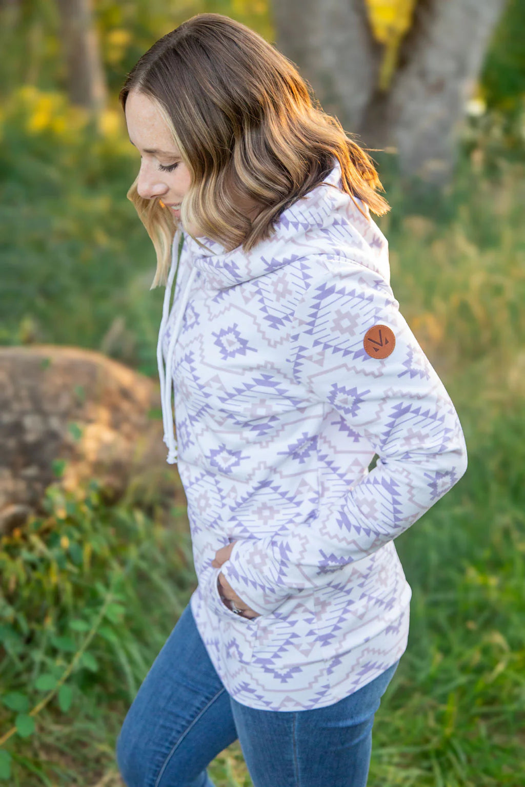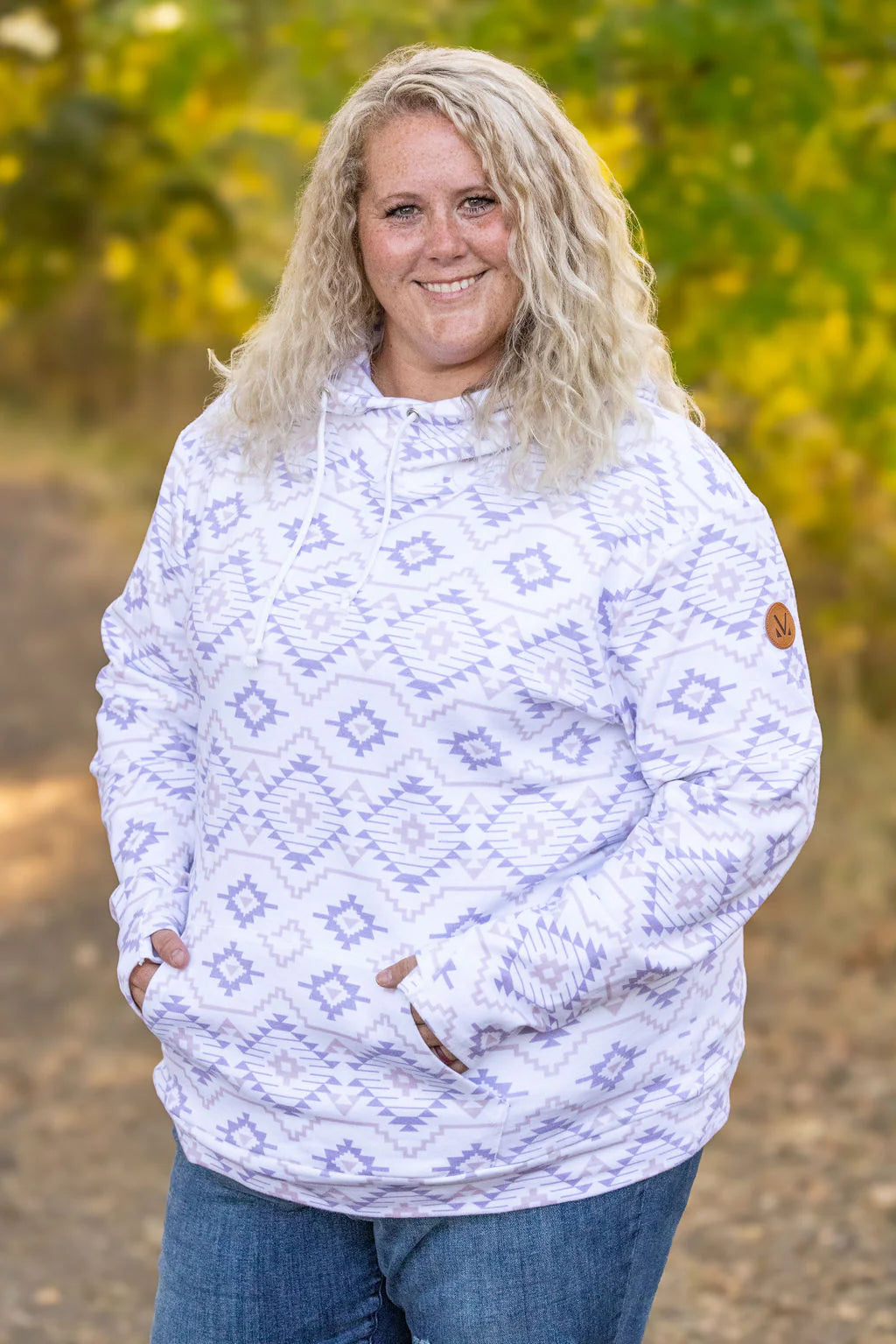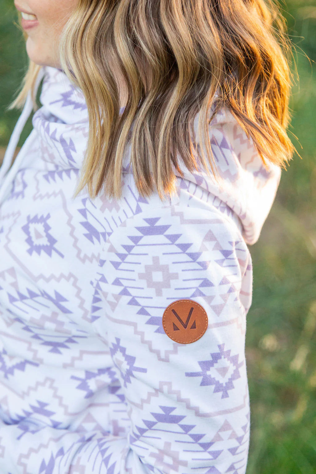 Stay cozy and stylish with the Ashley Hoodie in White Geometric! The unique geometric design, with purple and a blushy tan, will give you that cozy feel. Made with triple stretch material, it provides maximum comfort and movement. Keep your hands warm in the kangaroo pocket and use the thumbholes for added convenience. Look and feel happy with this must-have hoodie!
