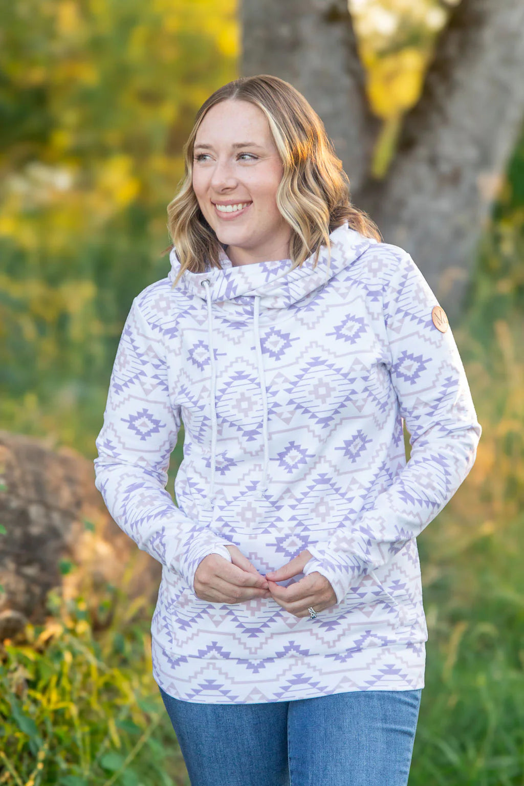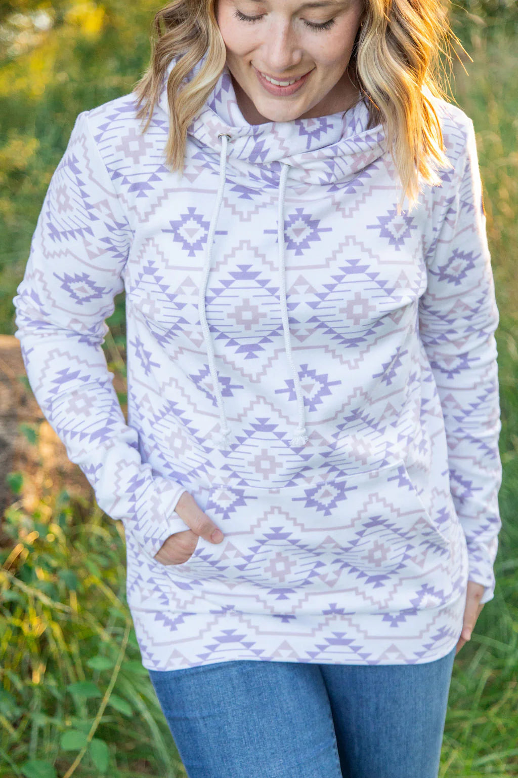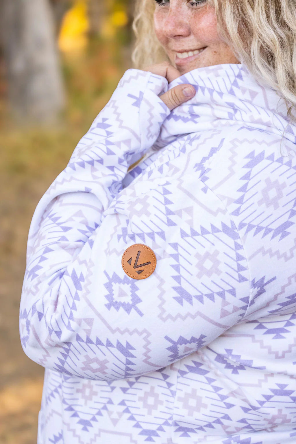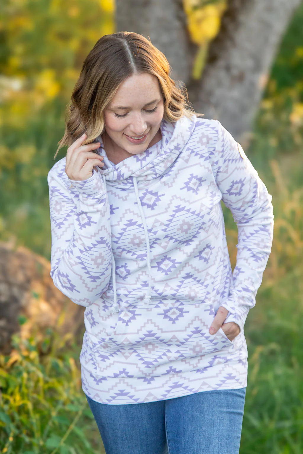 Stay cozy and stylish with the Ashley Hoodie in White Geometric! The unique geometric design, with purple and a blushy tan, will give you that cozy feel. Made with triple stretch material, it provides maximum comfort and movement. Keep your hands warm in the kangaroo pocket and use the thumbholes for added convenience. Look and feel happy with this must-have hoodie!