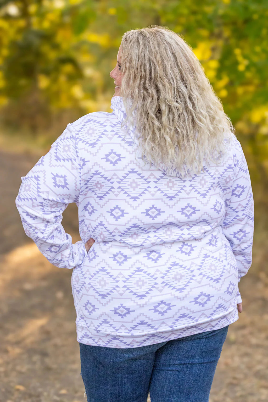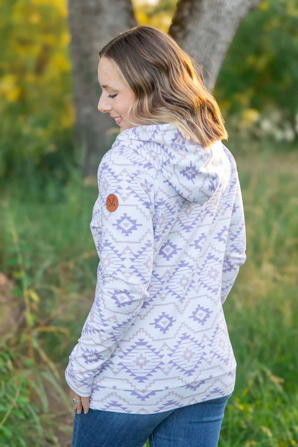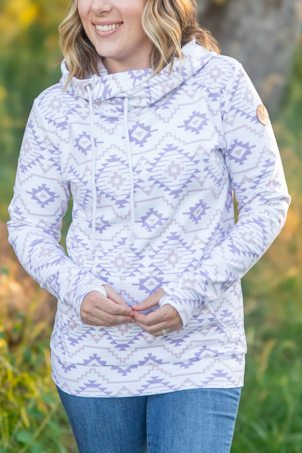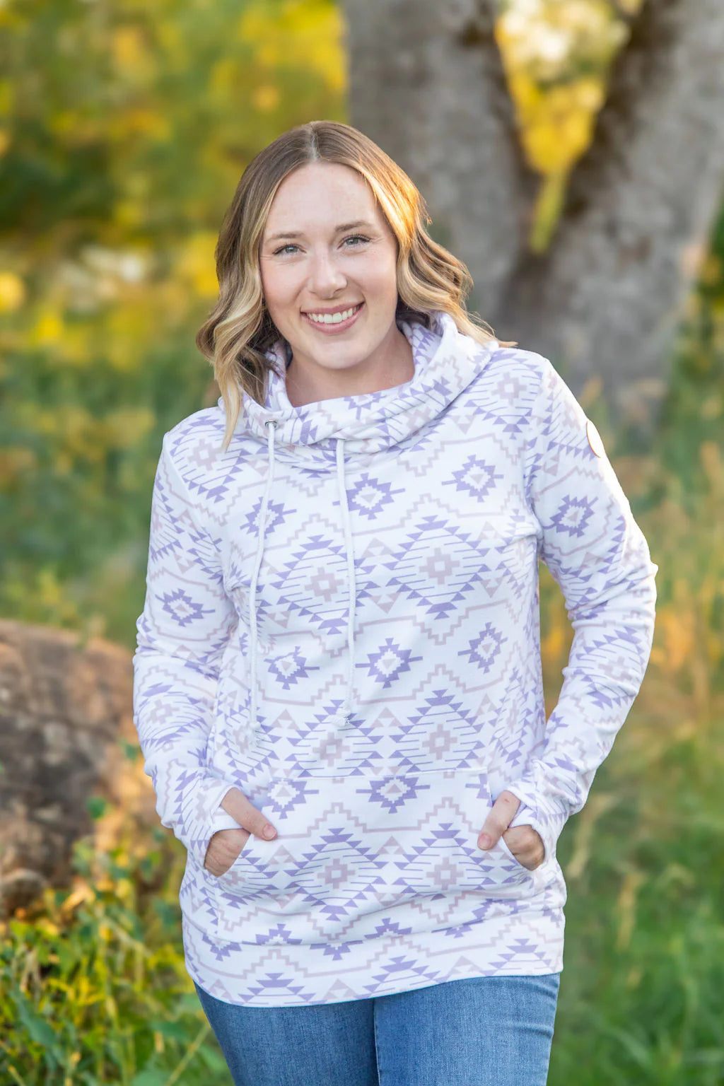 Stay cozy and stylish with the Ashley Hoodie in White Geometric! The unique geometric design, with purple and a blushy tan, will give you that cozy feel. Made with triple stretch material, it provides maximum comfort and movement. Keep your hands warm in the kangaroo pocket and use the thumbholes for added convenience. Look and feel happy with this must-have hoodie!