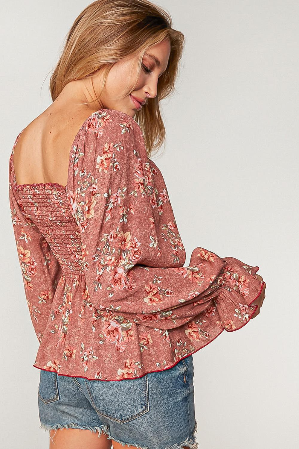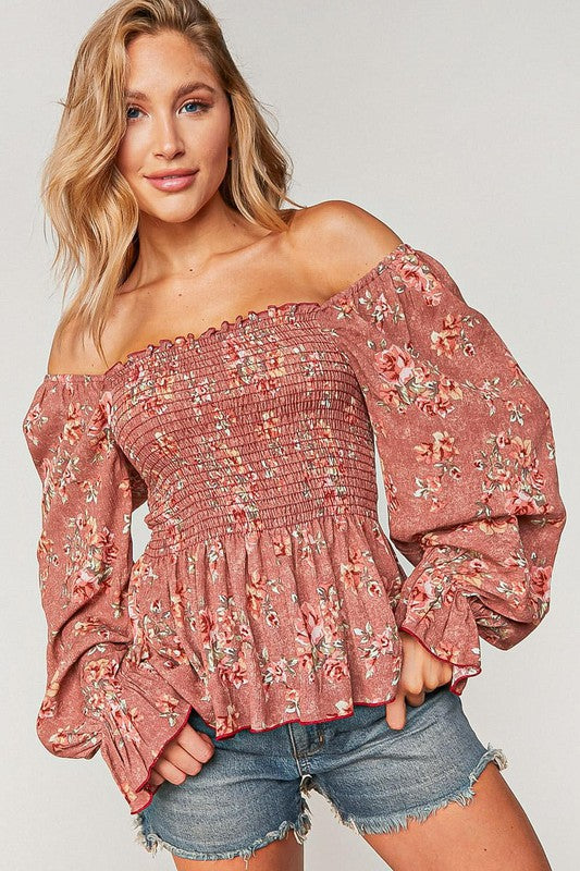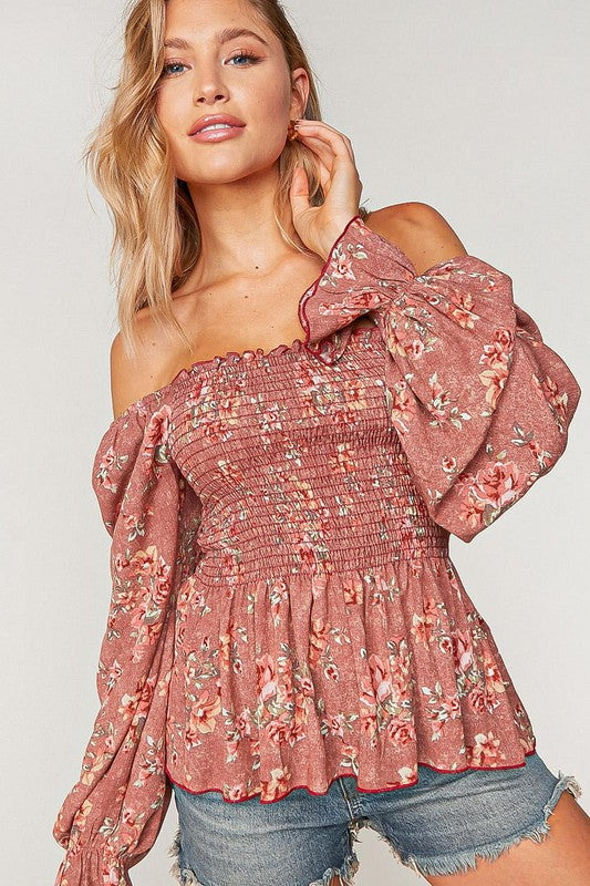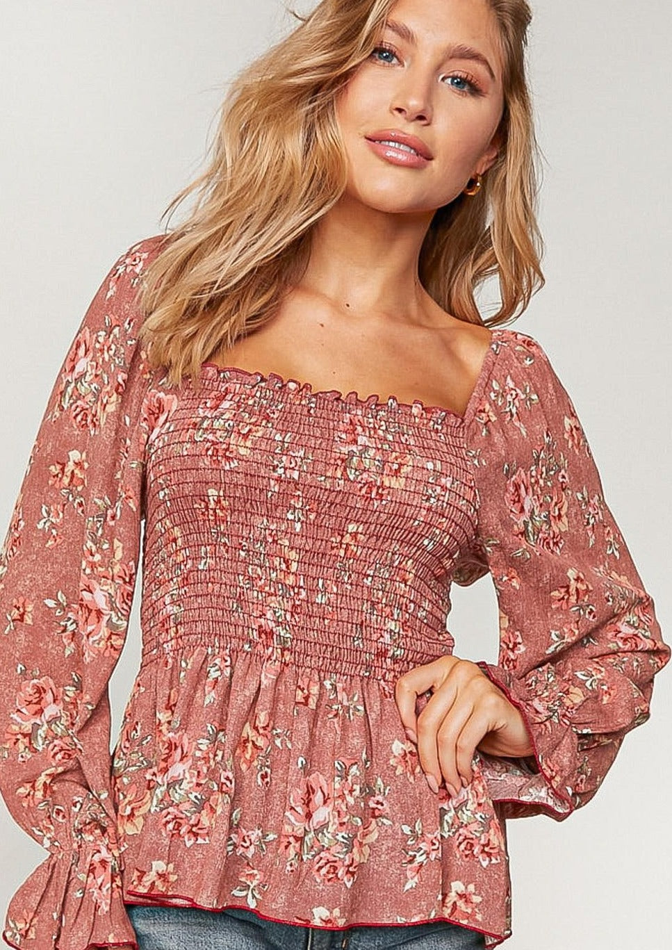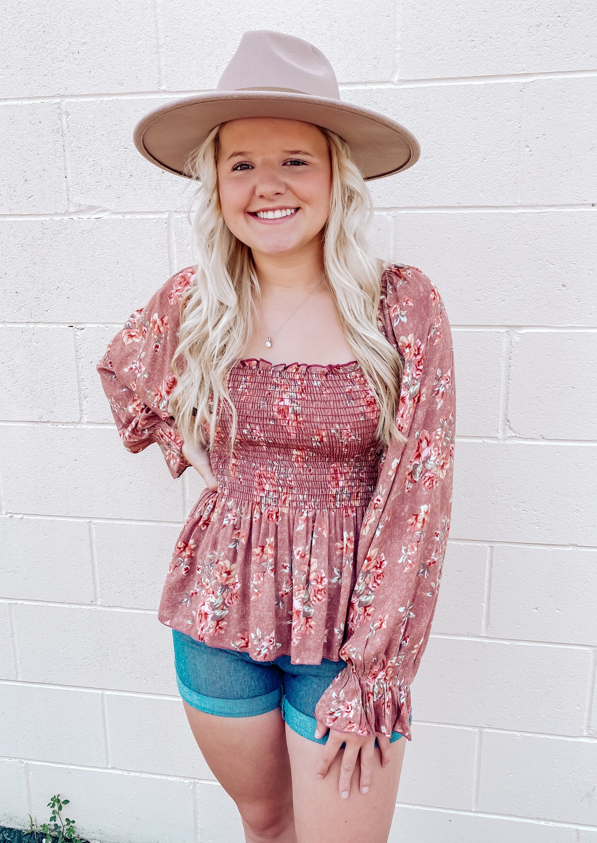 Make a statement in the Bristol Floral Babydoll Blouse! This unique mauve blouse is crafted from crinkled rayon for a bohemian look, featuring an floral print and square neckline that can be worn on or off the shoulder. With a ruffle hem and peplum babydoll silhouette, this smocked top is sure to turn heads. Ready for a smock-attack?
