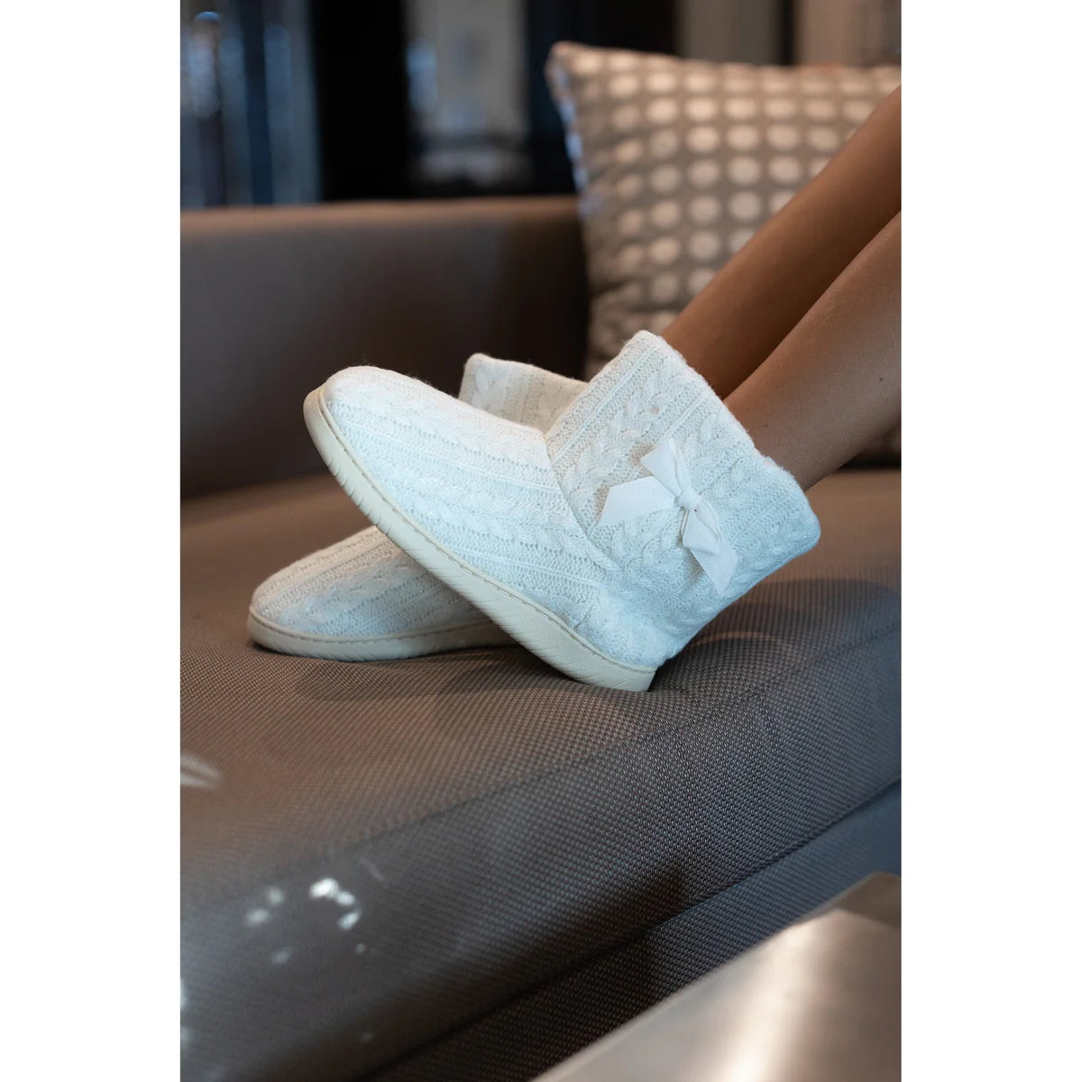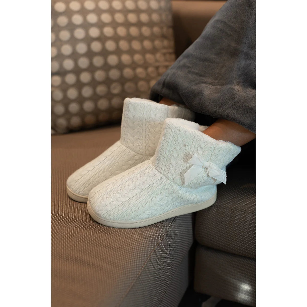 Get ready for winter with The Tessa Cable Knit Plush Bootie! This bootie is just as cuddly as it looks. The exterior is made from a plush material that ensures warmth and comfort. The stylish pattern is completed with a bow design for an added touch of sophistication.