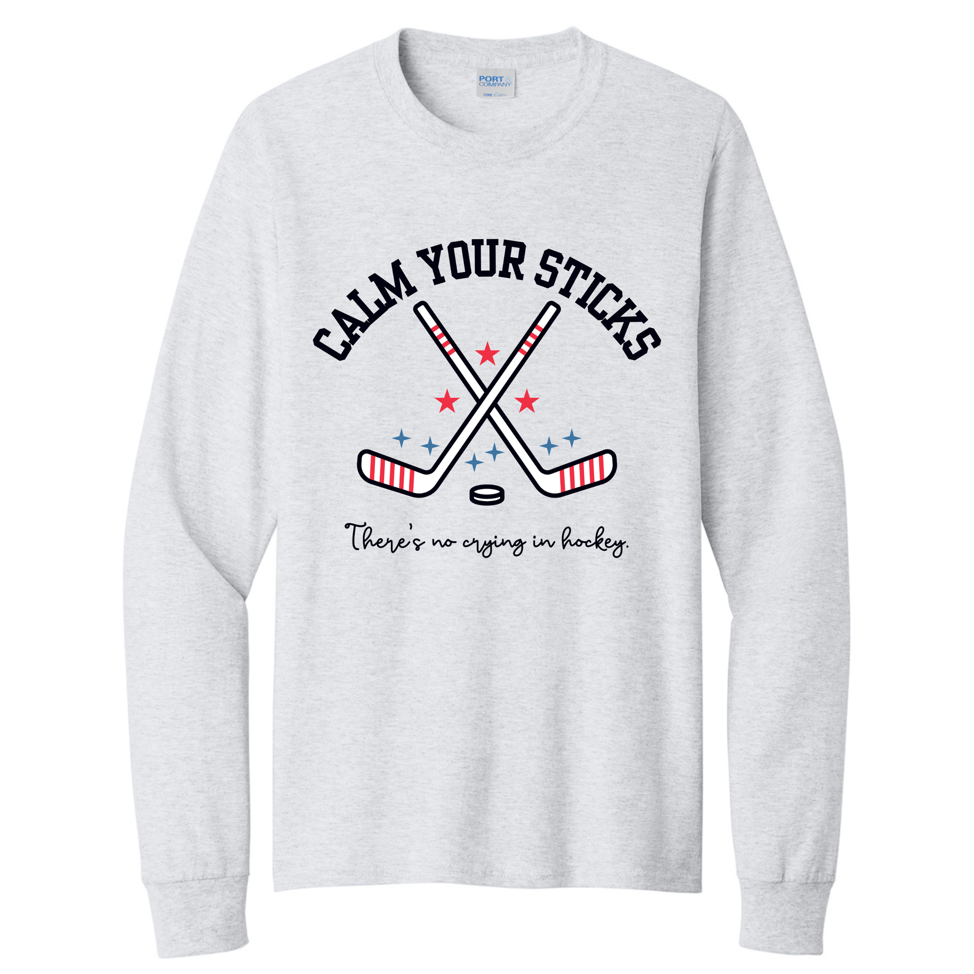 The “Calm Your Sticks—There’s No Crying in Hockey” graphic is a playful nod to the rink life we all know and love. Bold crossed sticks, classic stars, and a clean ash grey base make this one an easy favorite for players, parents, and fans who appreciate a good hockey quote.