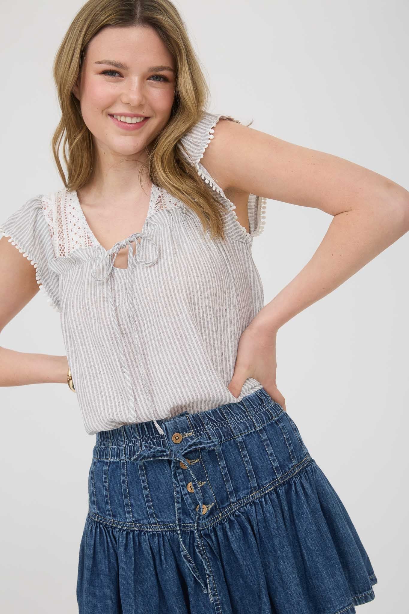 Say hello to your new go-to for effortless summer style. The Hailey Top is soft, sweet, and just the right amount of boho with its dreamy crochet lace yoke and dainty front tie. Featuring a relaxed fit, subtle grey stripes, and a breezy woven fabric, this lightweight top brings easy charm to any outfit.