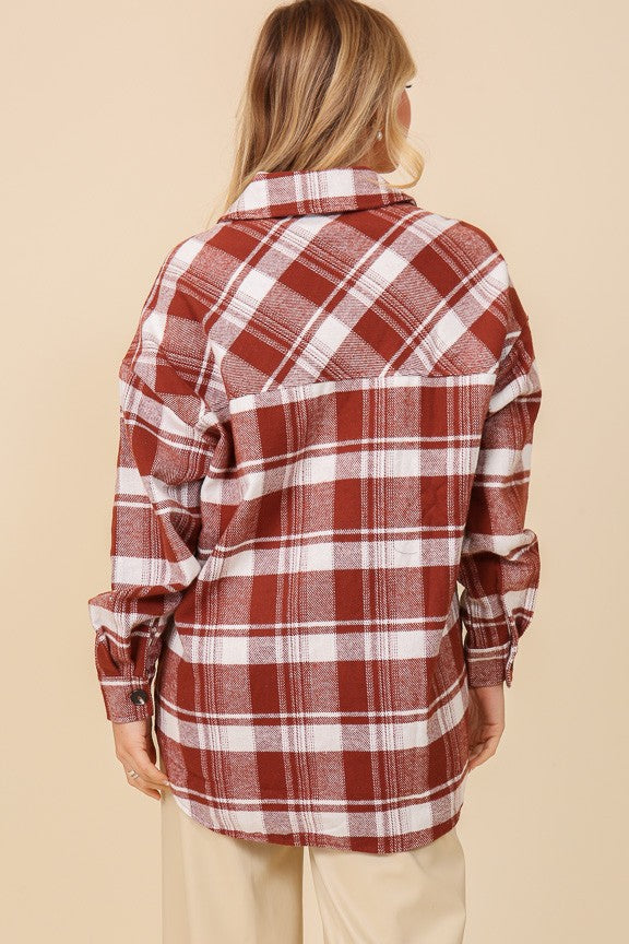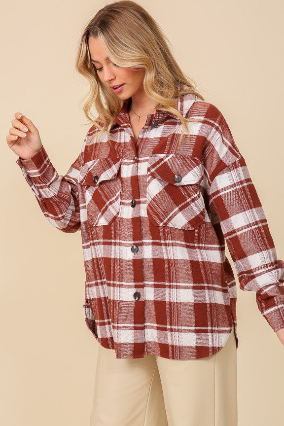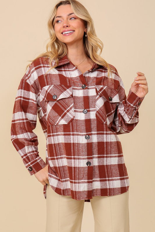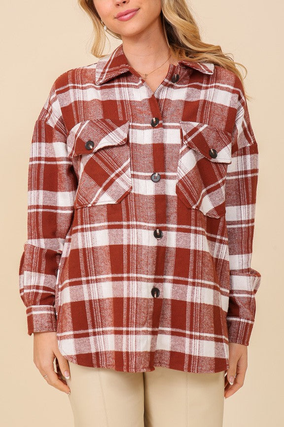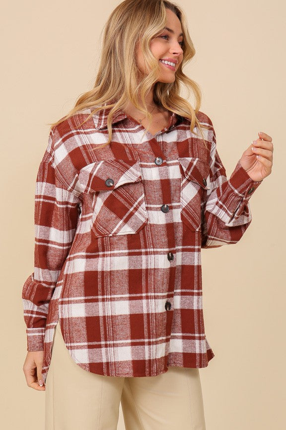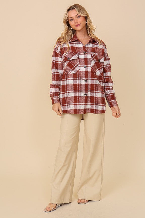A statement piece for the new season, this plaid shacket is the ultimate mix of style and comfort. Designed with an oversized, relaxed fit, it’s perfect for layering on chilly days. The button-front closure and dual chest pockets add a classic touch, while the soft, midweight wool-like fabric keeps you warm without feeling bulky. Effortlessly versatile, this piece pairs just as easily with denim and sneakers for a casual weekend look as it does with leggings and boots for a cozy, chic vibe.