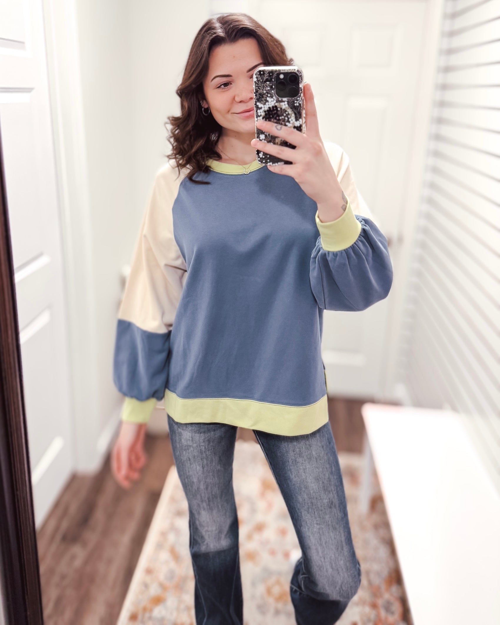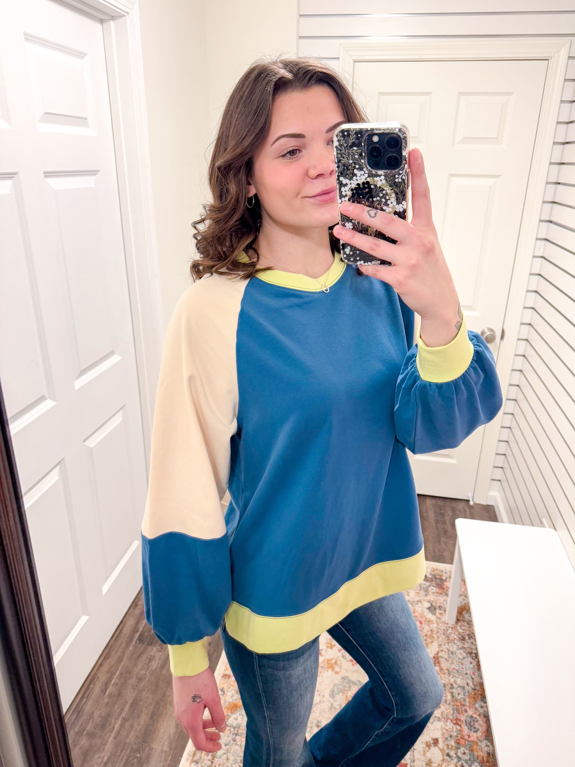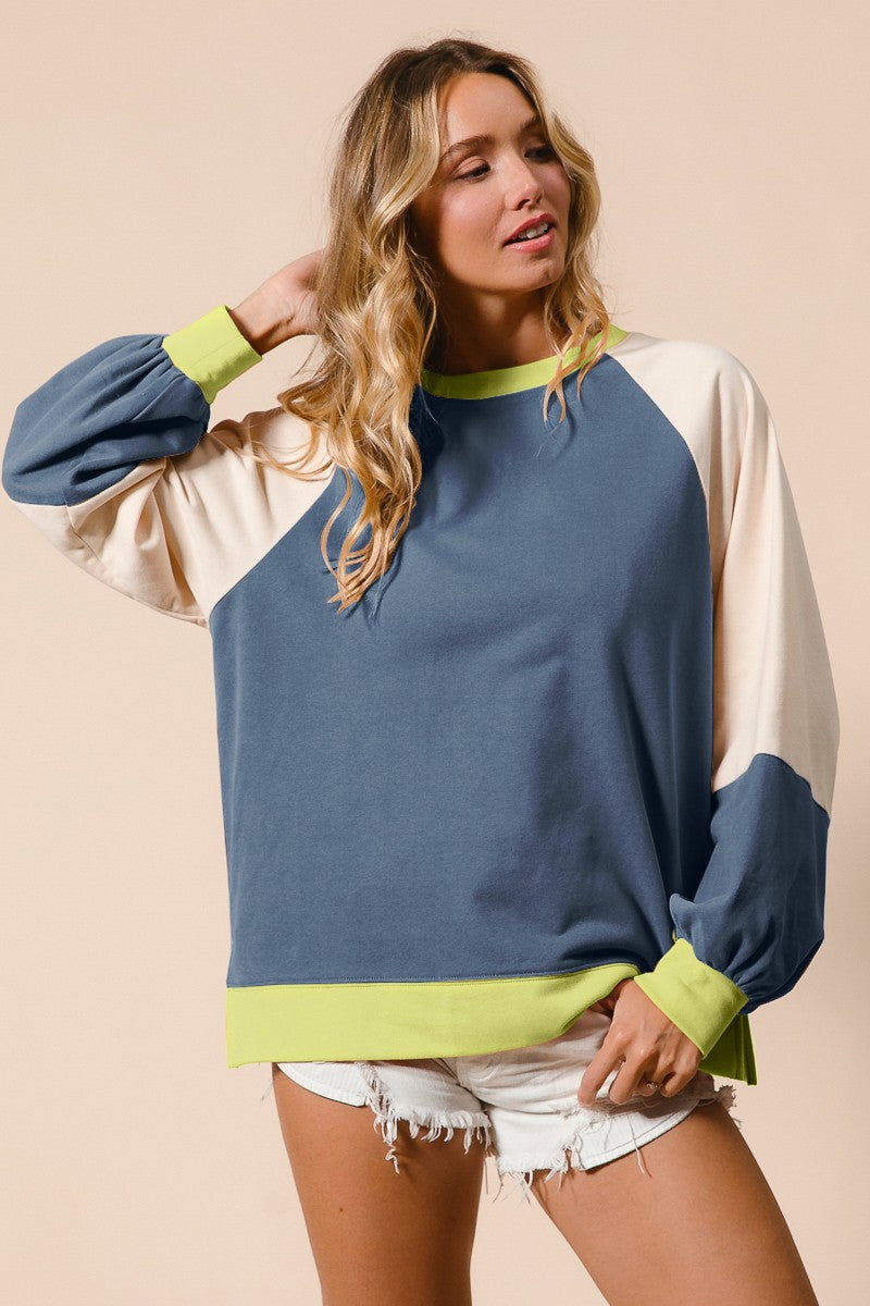 Introducing the Jamie Color Block Long Sleeve in Indigo/Lime! Made from soft French terry fabric, this top features a stylish color block design. Whether you're lounging at home or out for a day of fun, this top offers comfort and style in one!