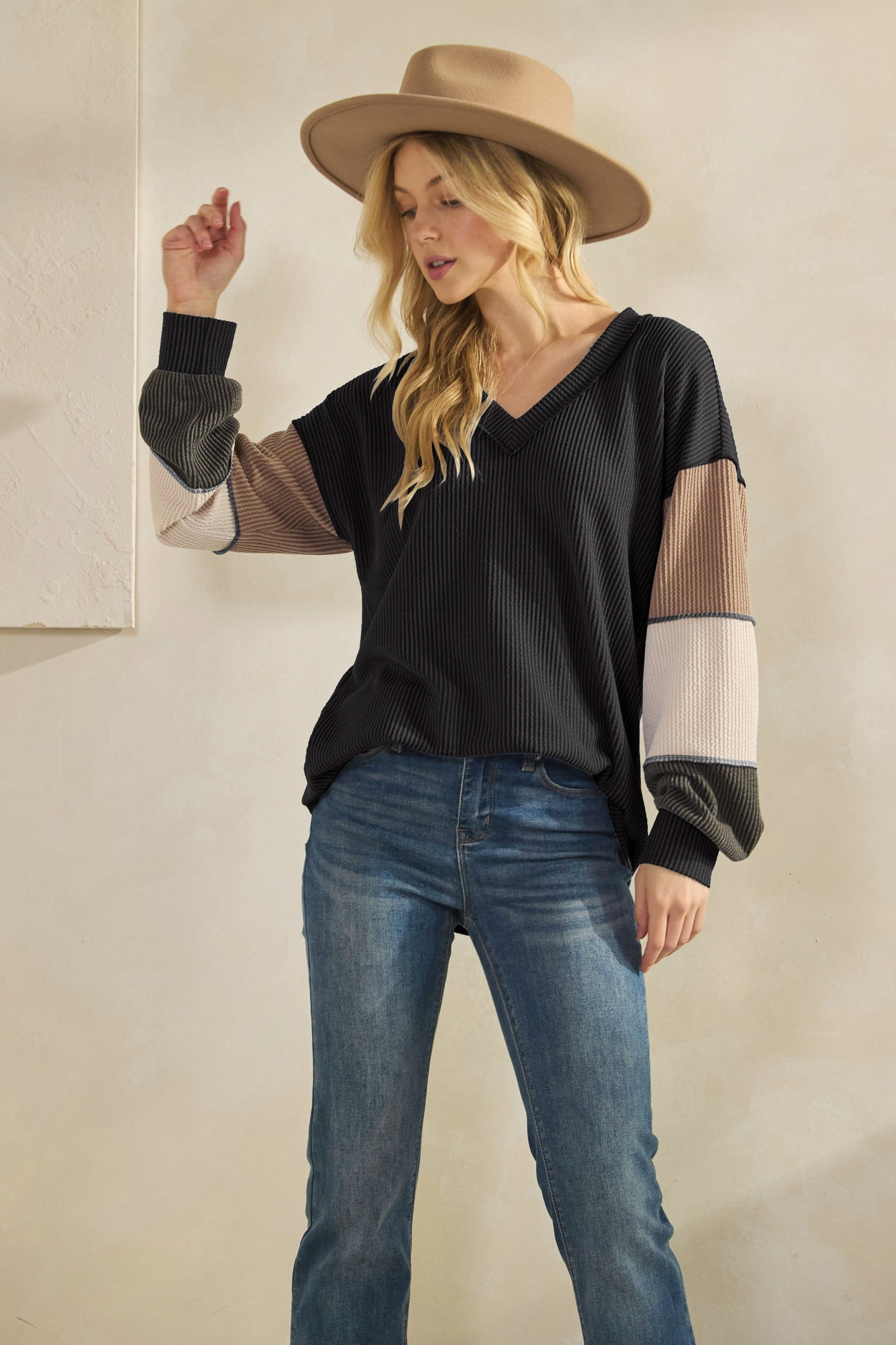 Your “I want to look cute but also… comfy” prayers have been answered. This urban rib knit top brings all the chill-girl vibes with a slouchy V-neck, relaxed fit, and those standout color block sleeves that basically scream effortlessly stylish.