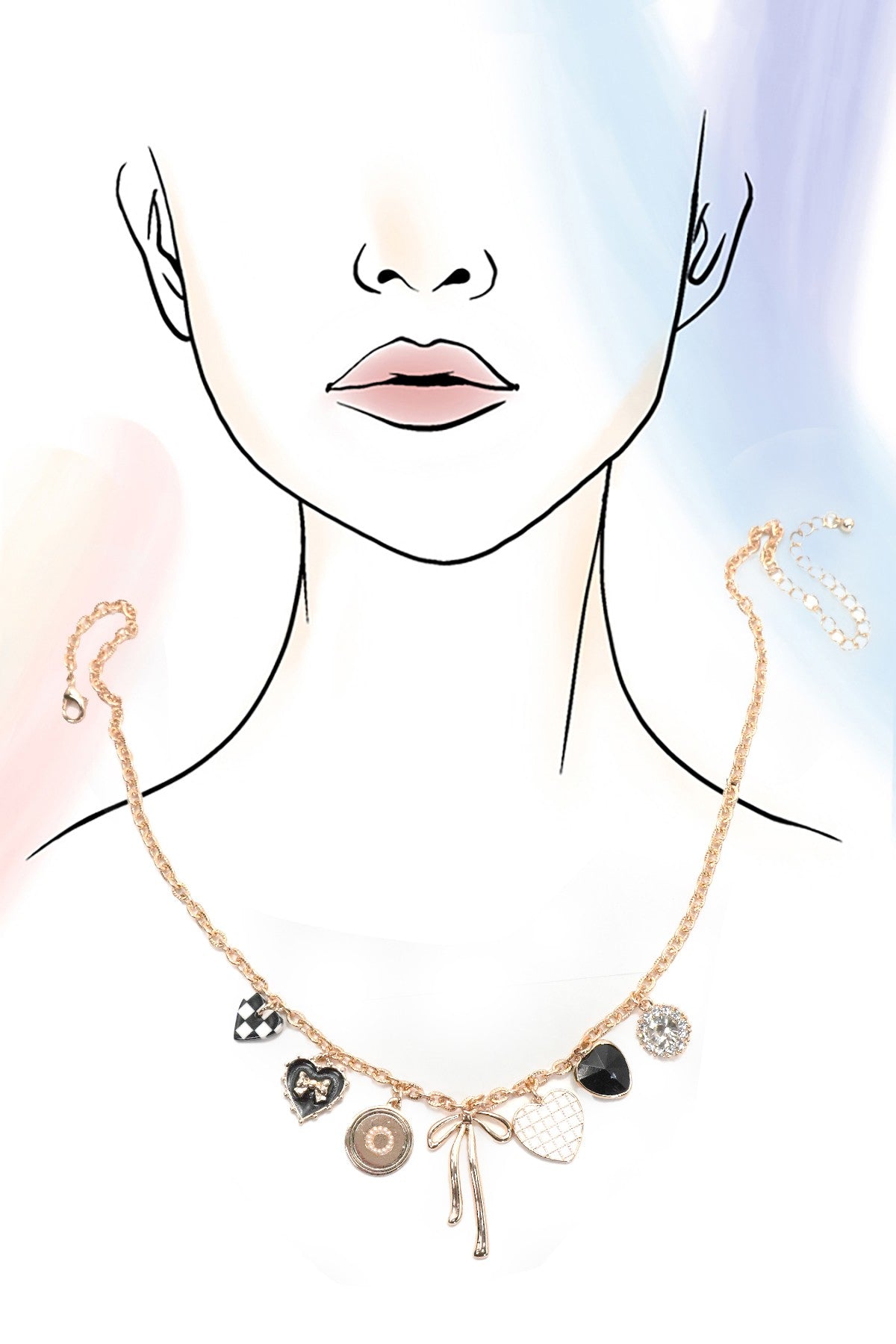 Meet your new go-to accessory: the Kane Mixed Charm Chain Necklace. This bold-meets-darling piece features a curated medley of charms—checkerboard hearts, glitzy rhinestones, classic bows, and edgy enamel hearts—all dancing from a sleek gold-plated chain. Every charm brings its own personality, from glam to playful, giving you a necklace that speaks volumes without saying a word.