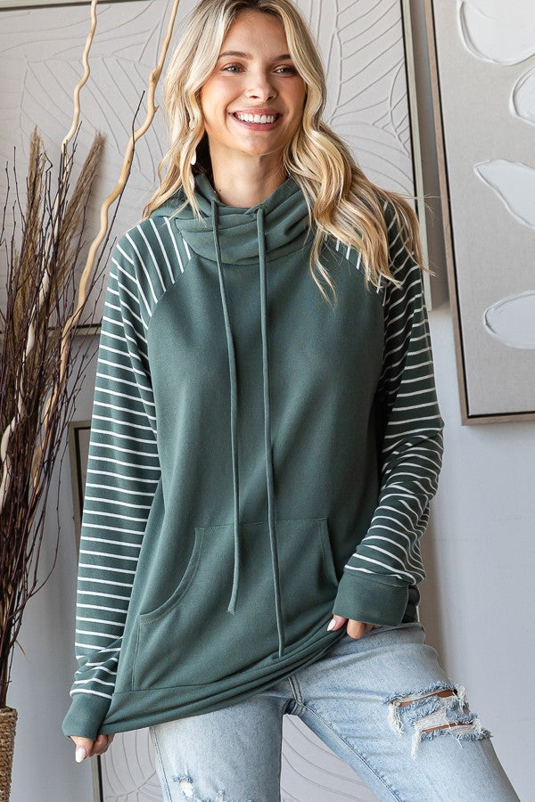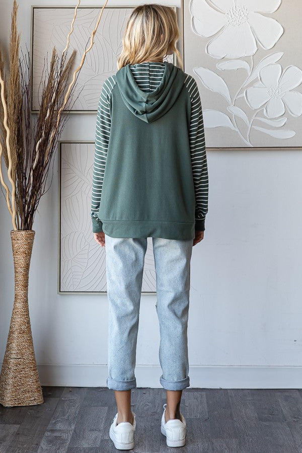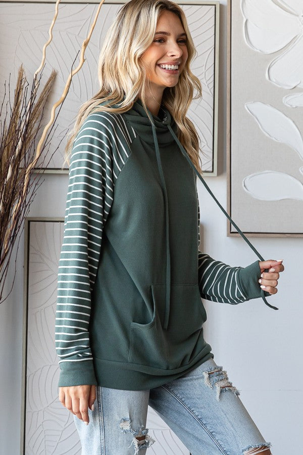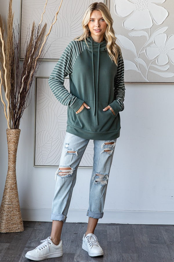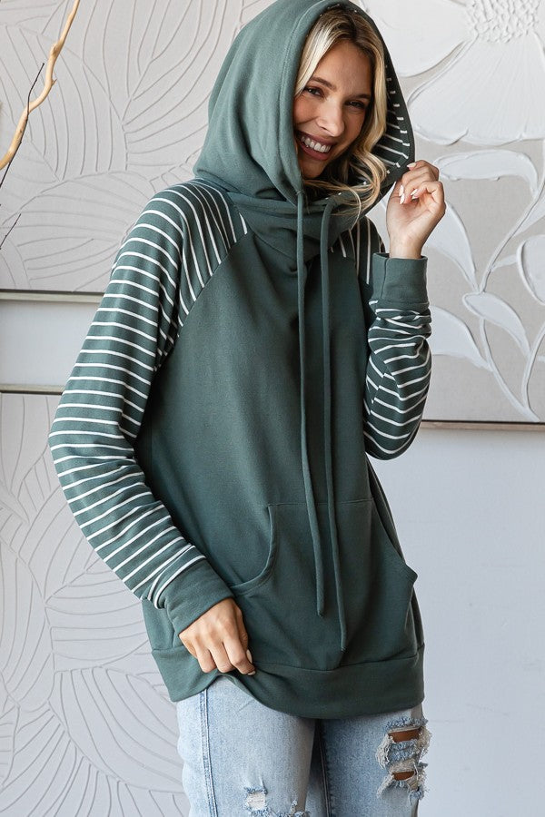 Elevate your style with our Lennon Stripe Contrast Hoodie in Olive! This solid knit sweater features a stripe contrast, drawstring hoodie, raglan long sleeves, and a banded hem. Stay cozy and on-trend with the added front pocket for convenience. Perfect for any casual occasion, this hoodie is a must-have for your wardrobe.