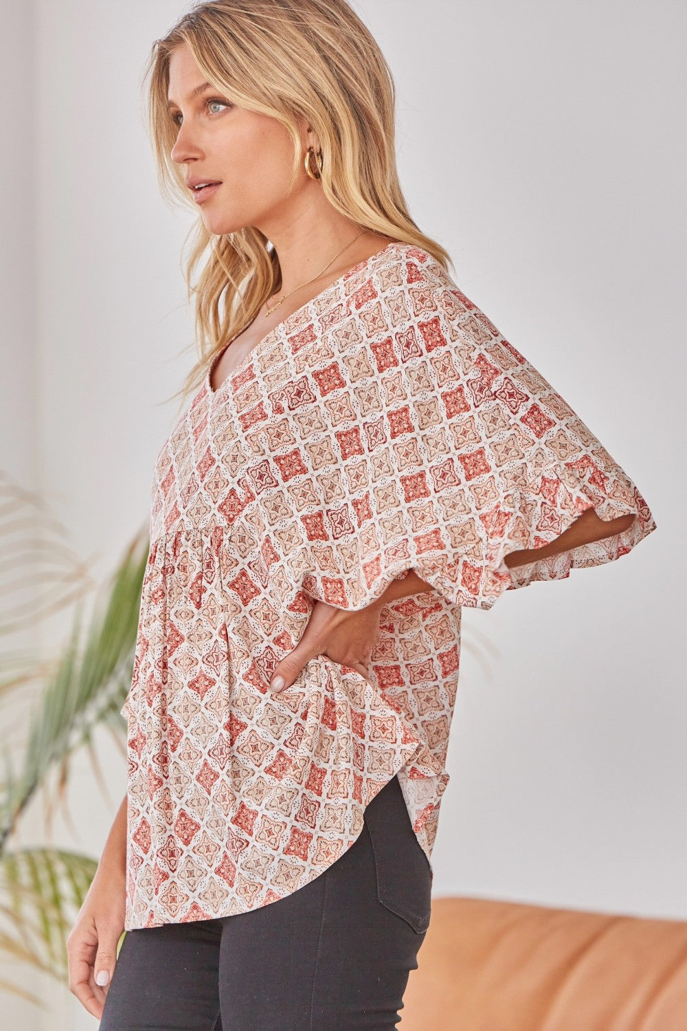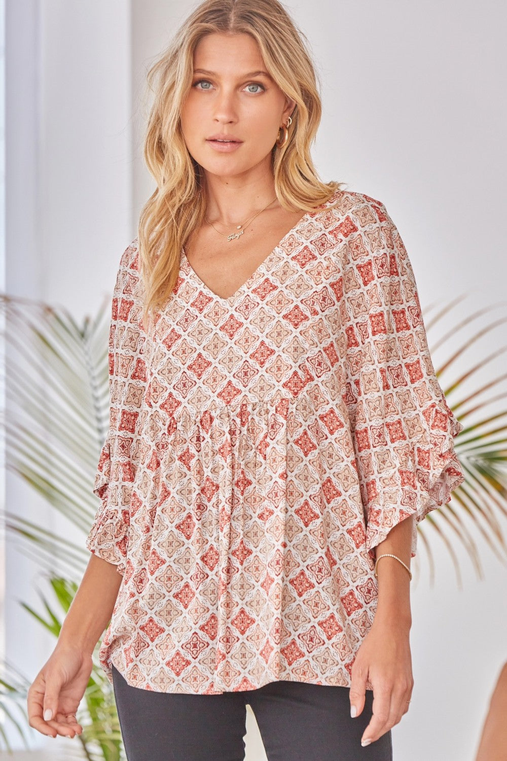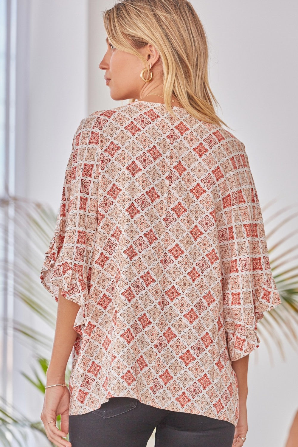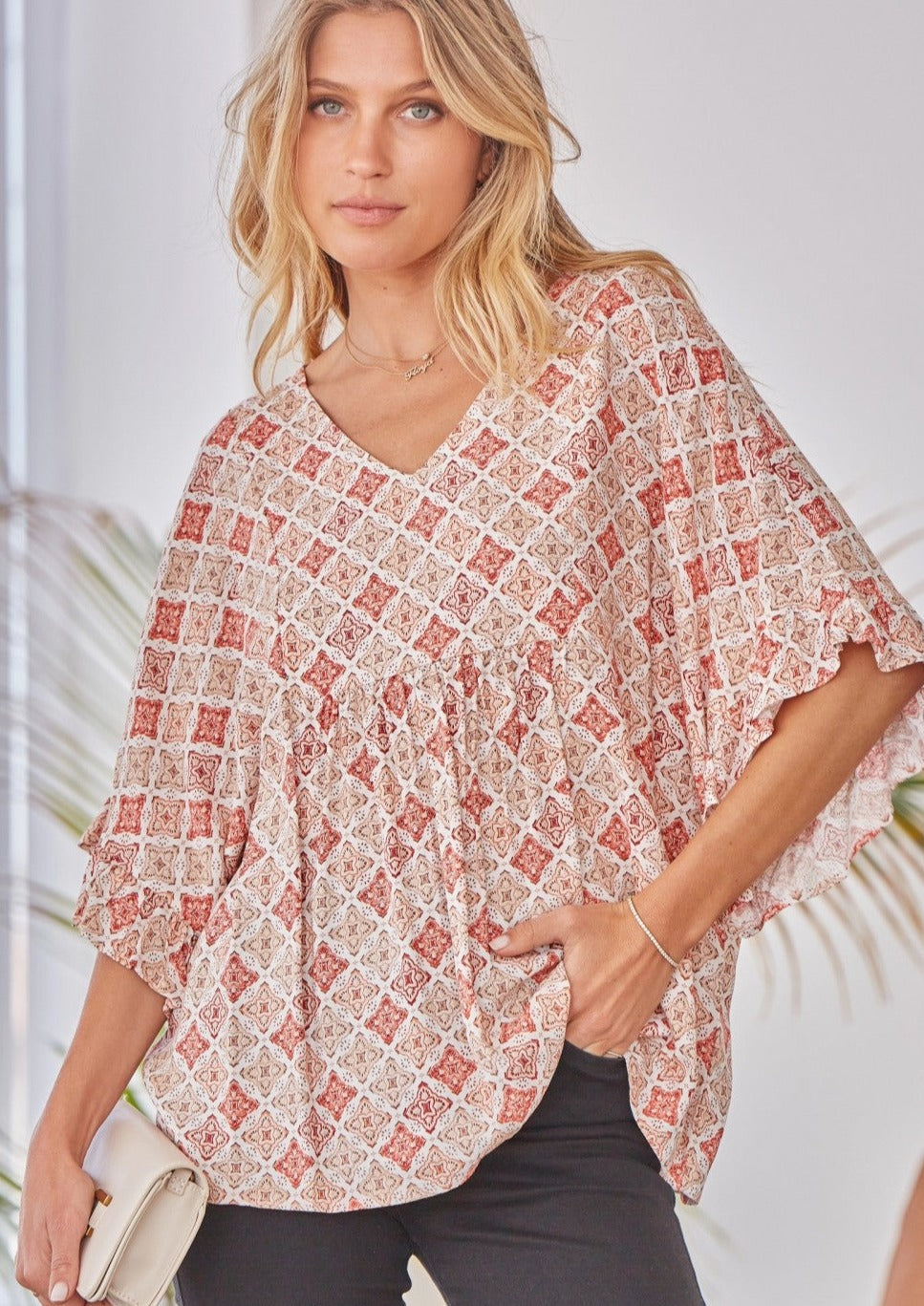 All over print on a poncho inspired blouse. Featuring a v neck, flowy bodice, and kimono inspired ruffled sleeves.