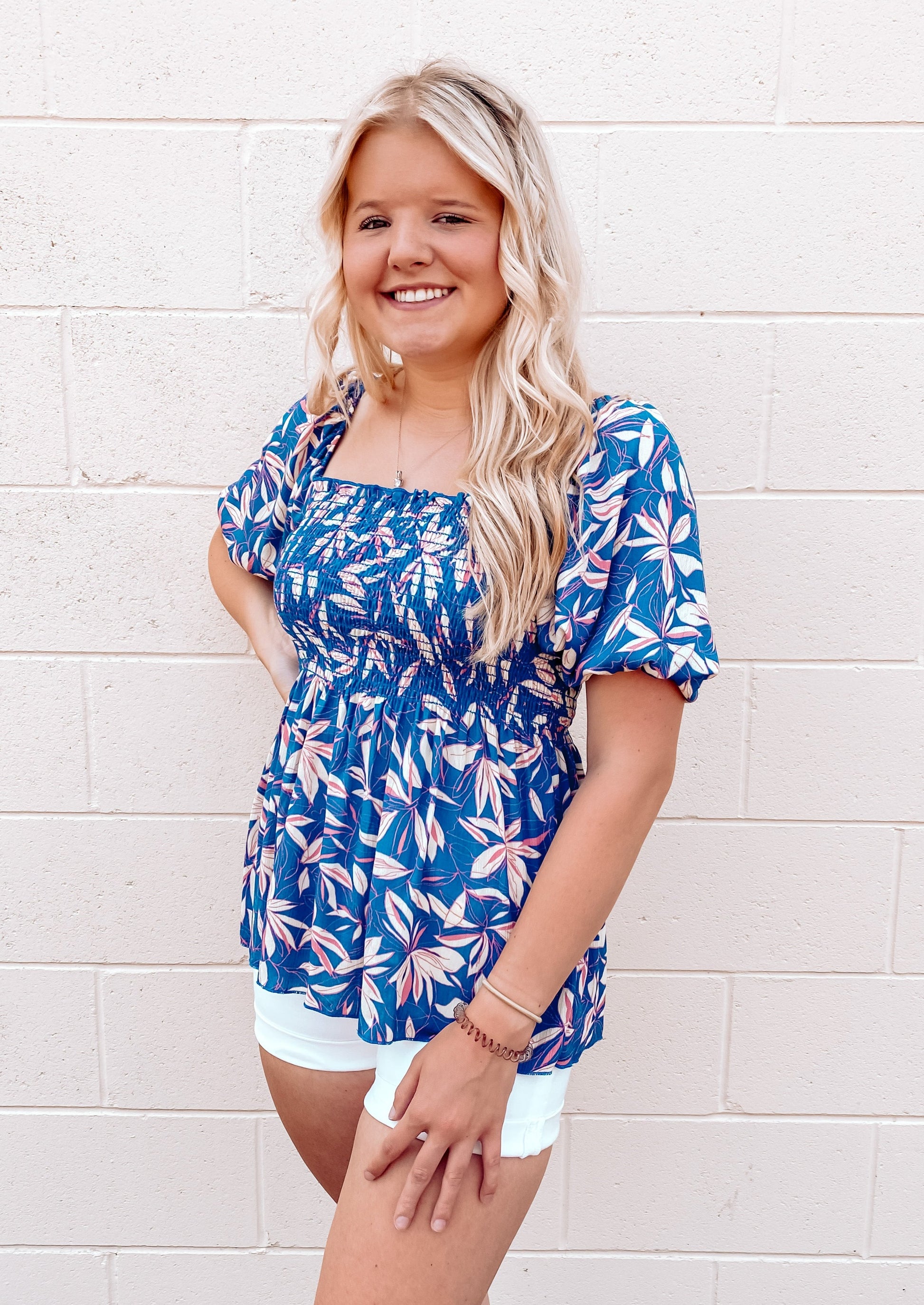 Be a trendsetter in this Piper Floral Smocked Babydoll Top! With its unique ruffle smocking fit and fashionable flare, you'll surely be ready for any summer occasions. Plus, with a rayon crinkle fabric and eye-catching floral print, it's no wonder that you'll be the center of attention! (No pressure, though).