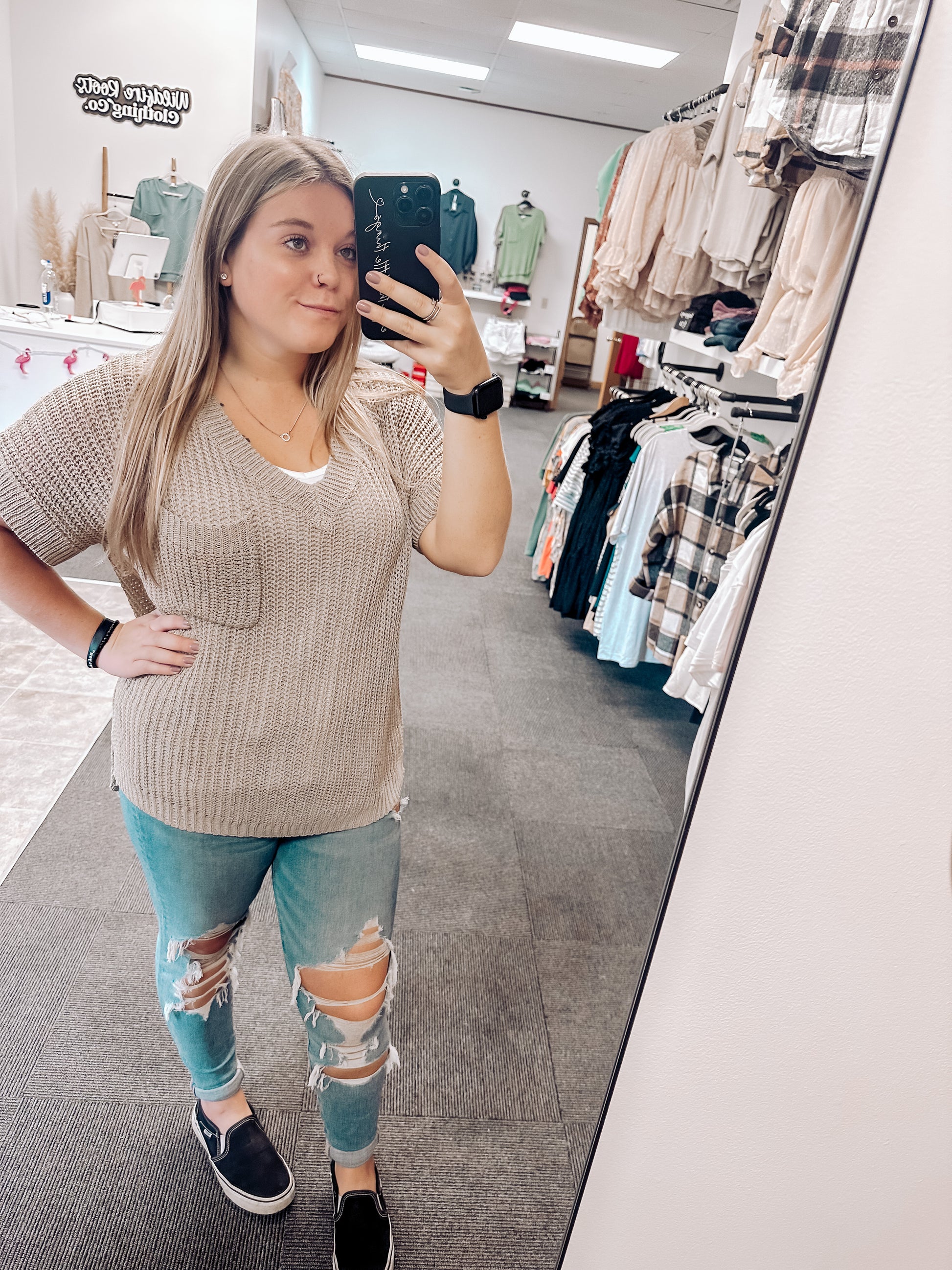Stay cozy and look chic in the Ryann Sweater Top! This low-gauge sweater rocks a v-neck, making it the perfect top to wear on or off the shoulder. Get ready to look fab in this cappuccino-colored stunner! Who said you couldn't look stylish while being lazy?