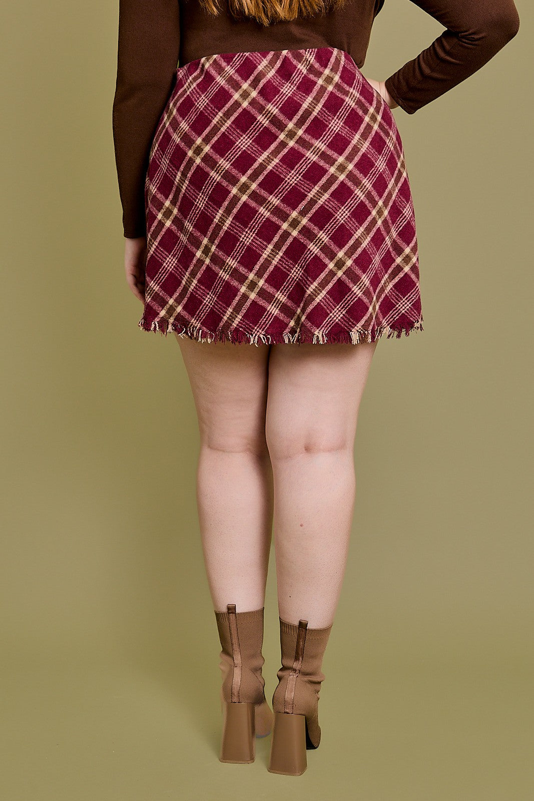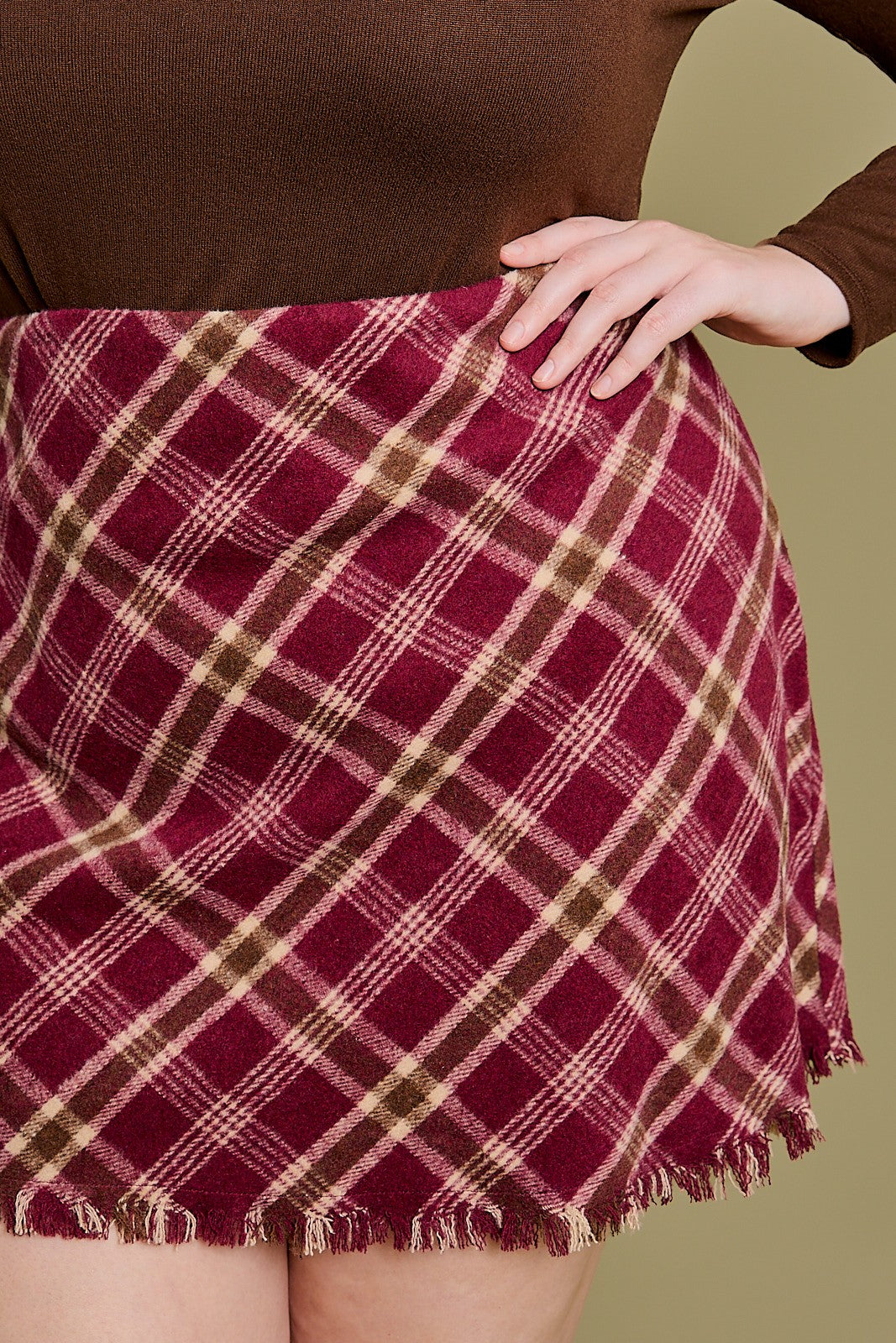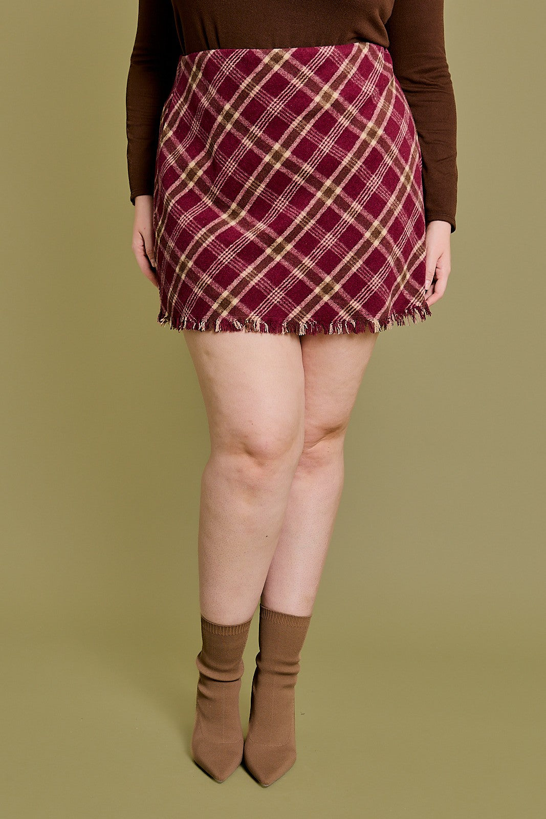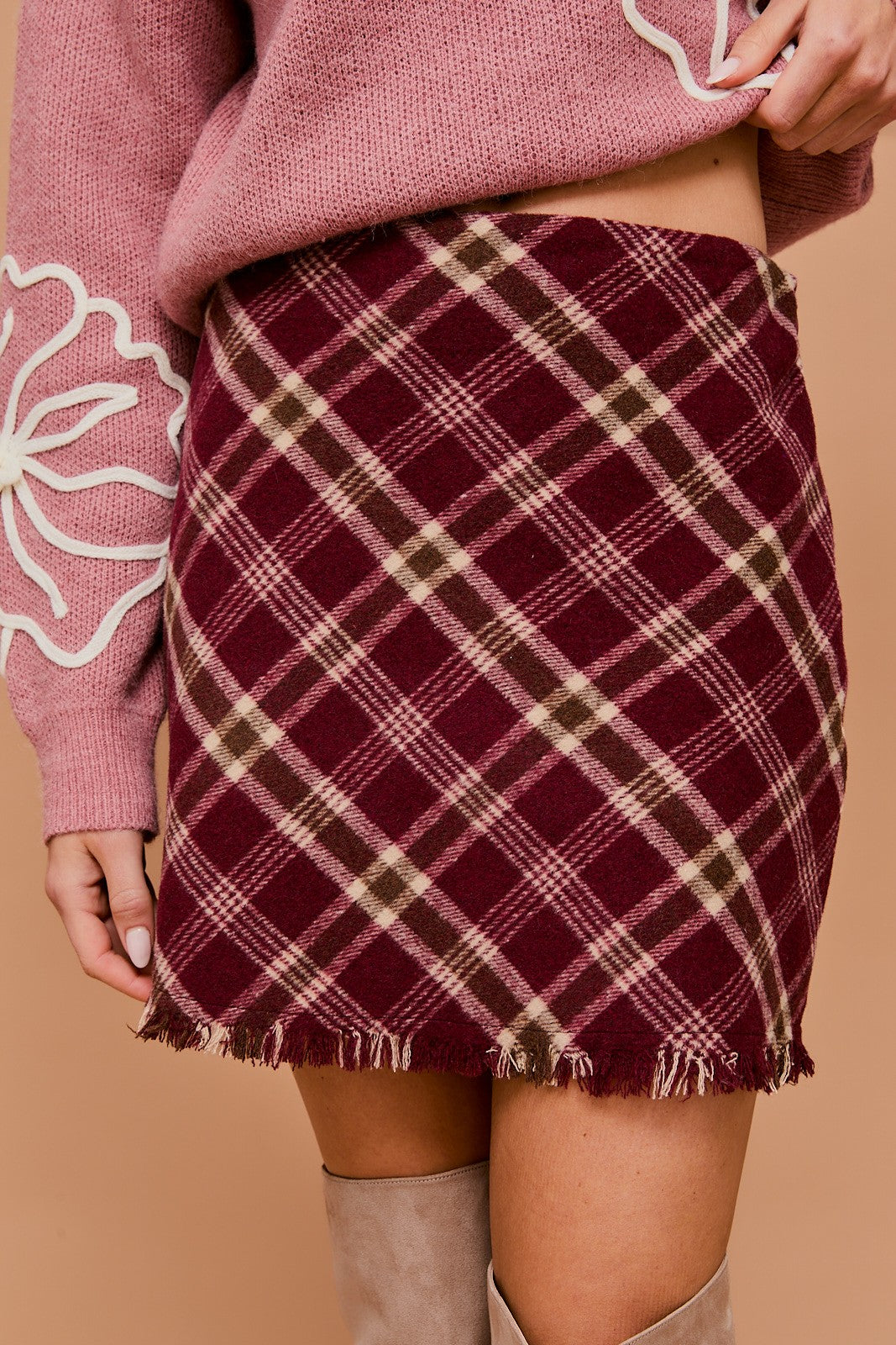 Make a bold statement with the Teagan Plaid Mini Skirt in Burgundy. Bias plaid pattern and frayed hem add a touch of edge to this stylish mini skirt. Perfect for a night out or a day at the office. Dare to stand out with Teagan!
