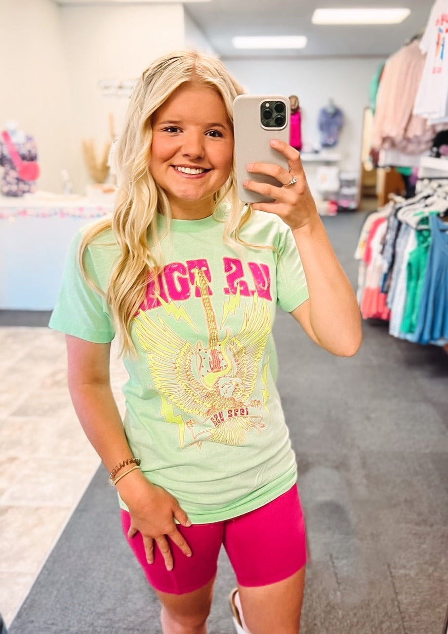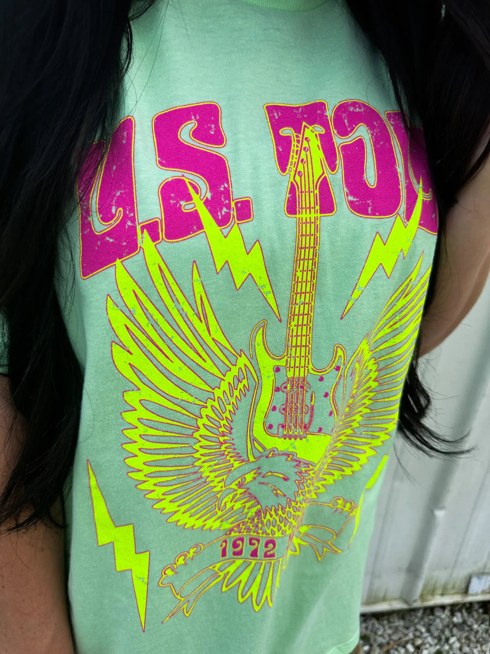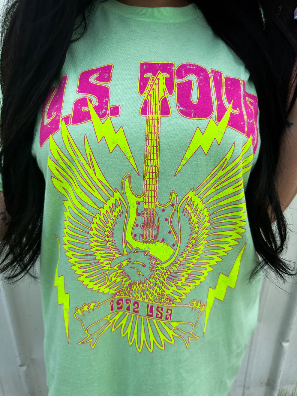Score some serious rock-star vibes with our US Tour Graphic Tee | Neon! It's the perfect way to show your American pride while turning heads with its bold, bright colors. Make a statement with this tee and rock on!